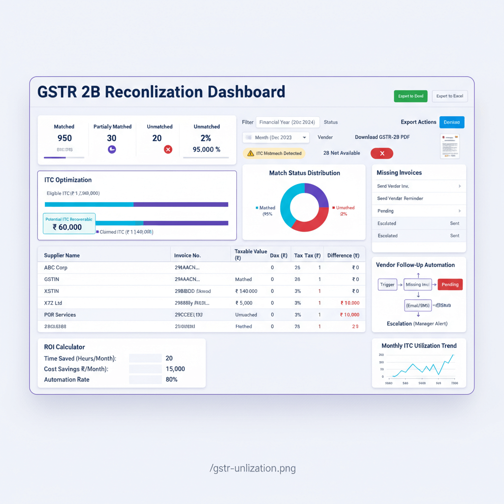 GSTR-2B reconciliation tools fix this with automated matching, intelligent exception buckets, vendor nudges, and rule driven ITC claim optimisation. You also gain a live monthly dashboard to see eligible, claimed, and deferred credits in one place.
