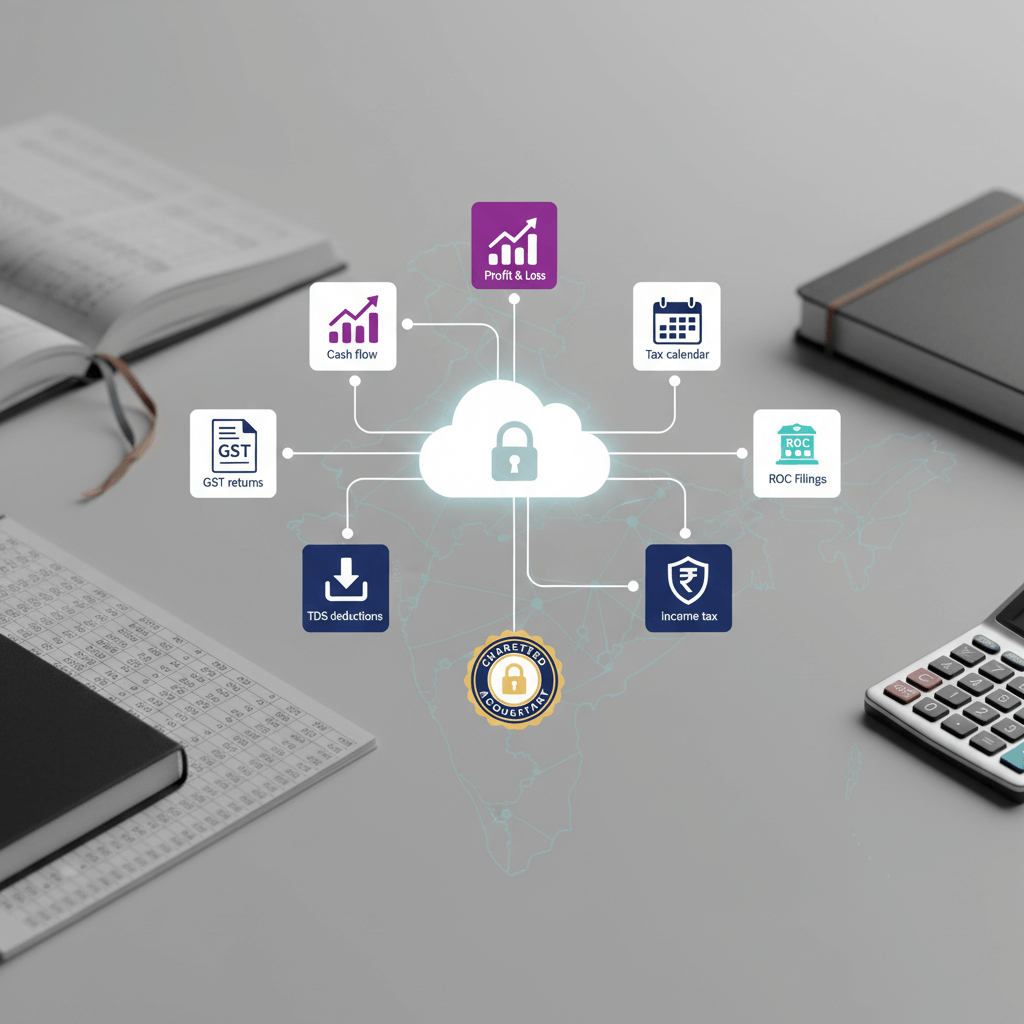 - Regulatory calendars: GST, TDS, payroll, company law, mapped to owners and due dates